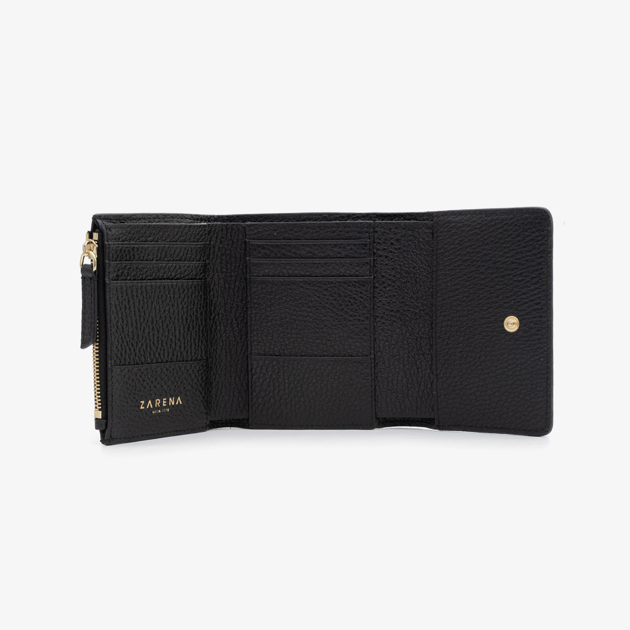 Трикрилно портомоне от естествена кожа. Този аксесоар ти позволява по един изключително удобен начин да съхраняваш своите карти, бележки, документи и пари. Малкият размер на модела дава възможност да го носиш навсякъде със себе си в различни видове дамски чанти.