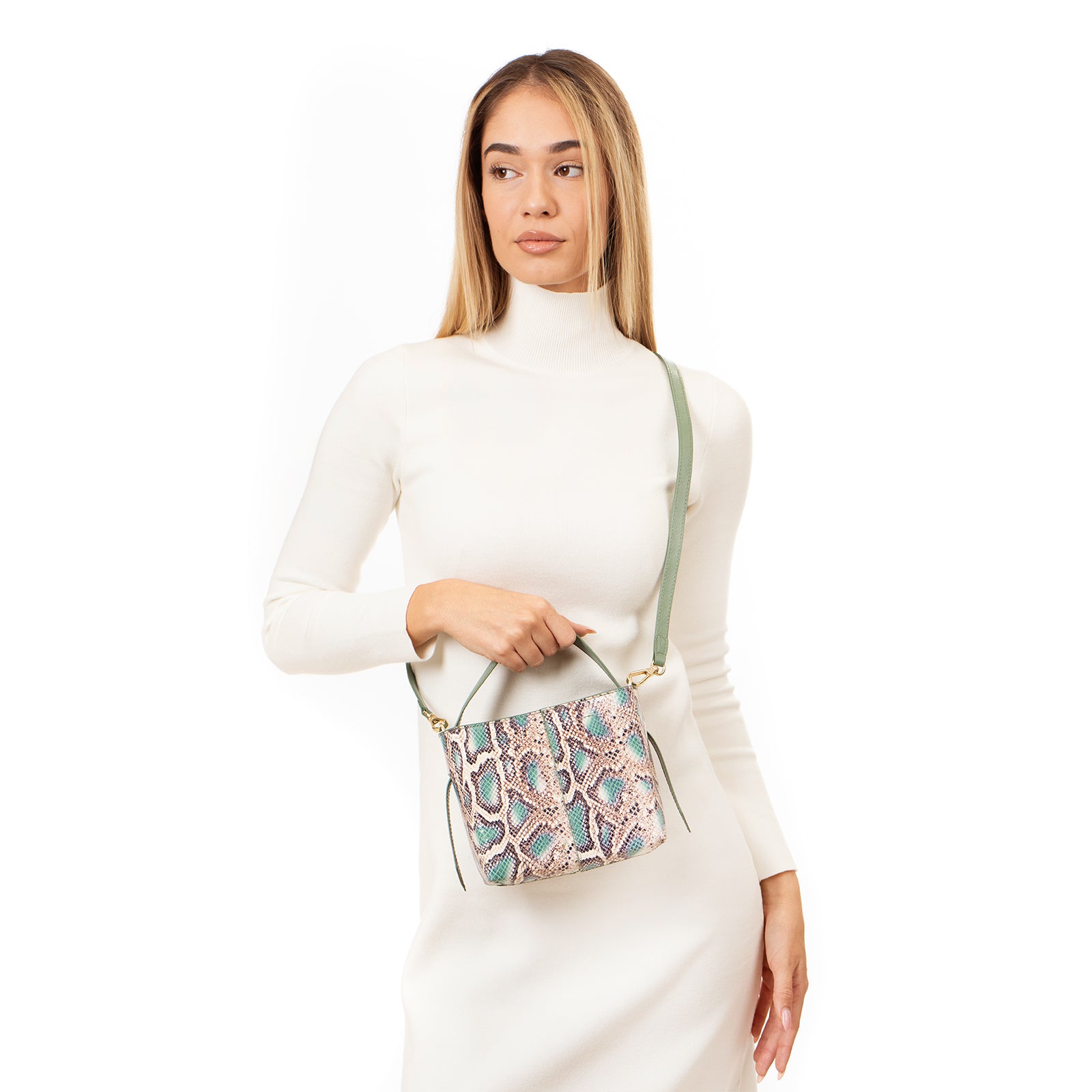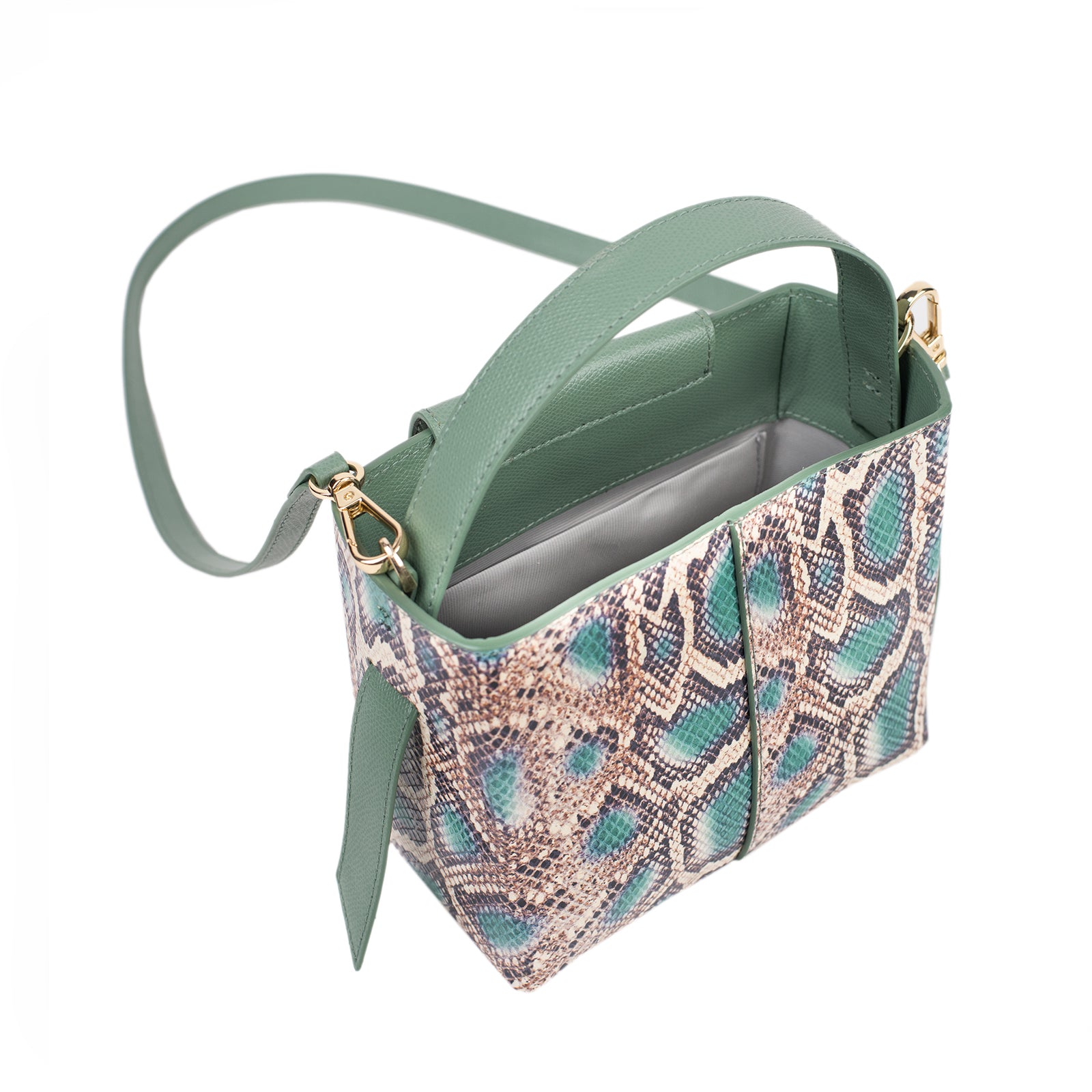 Dakota - малка крос боди чанта - цвят зелен със змийски принт