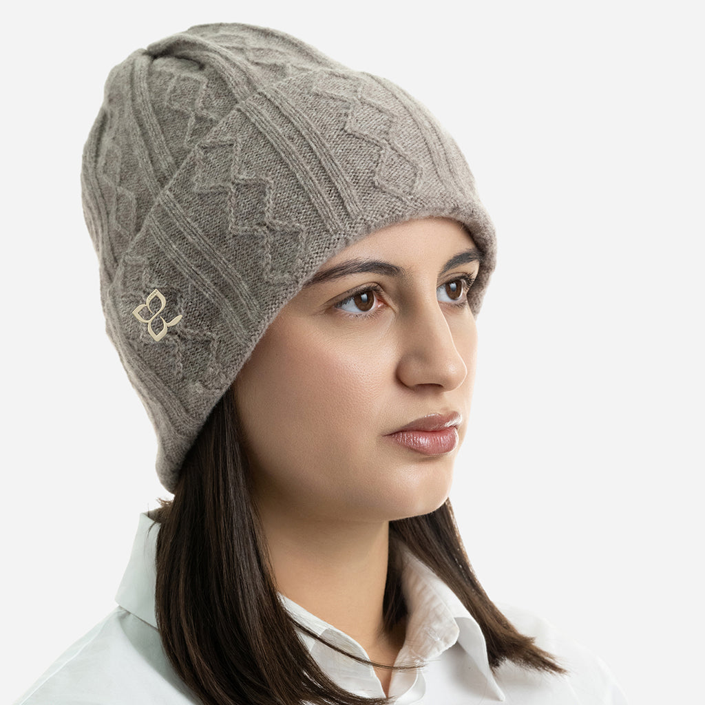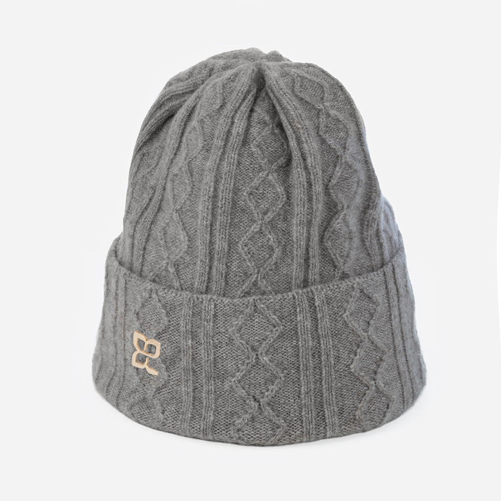 Плетена шапка с плетеници и метално лого - сивкаво бежова
