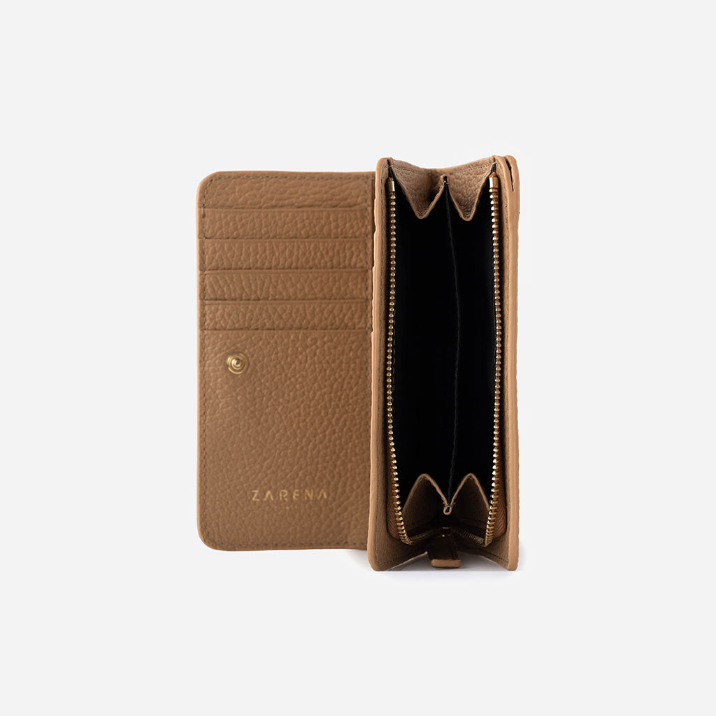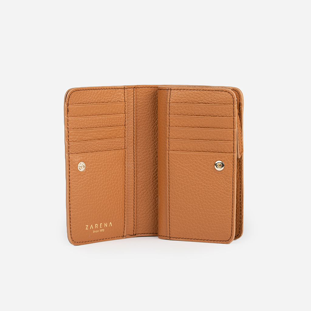 Средно портмоне от естествена кожа. Този аксесоар ти позволява по един изключително удобен начин да съхраняваш твоите карти, бележки, документи и пари. Практичният широк дизайн на модела разрешава лесно да го носиш в чантата си.