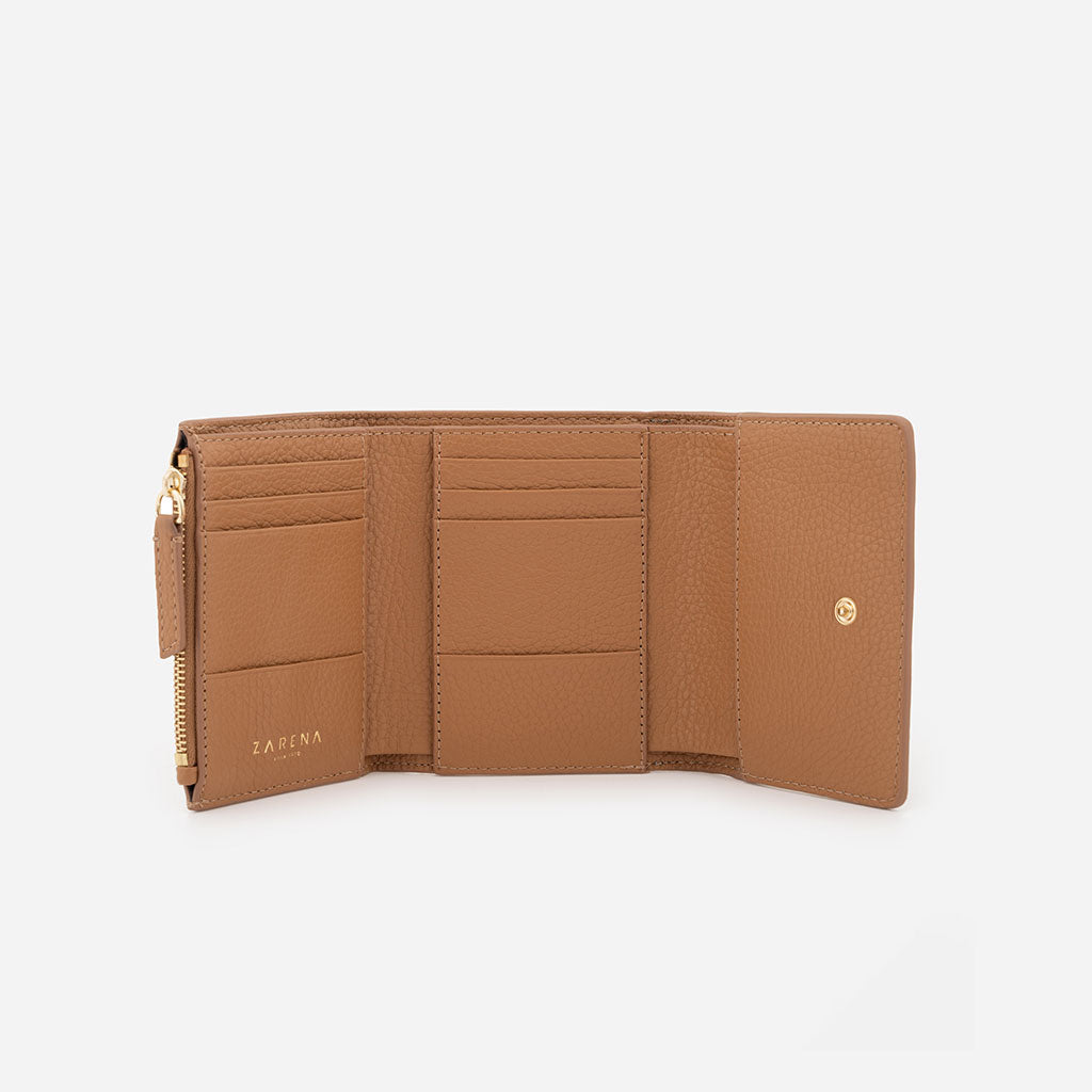 Трикрилно портомоне от естествена кожа. Този аксесоар ти позволява по един изключително удобен начин да съхраняваш своите карти, бележки, документи и пари. Малкият размер на модела дава възможност да го носиш навсякъде със себе си в различни видове дамски чанти.